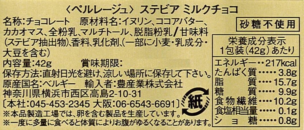Rich belgian chocolate and vegetable-derived sweetener Stevia's gentle sweetness is compatible with it, and it is a recommended chocolate for people who care for health, plus plenty of dietary fiber inulin made from plants such as Jerusalem artichokes, burdocks, and chives