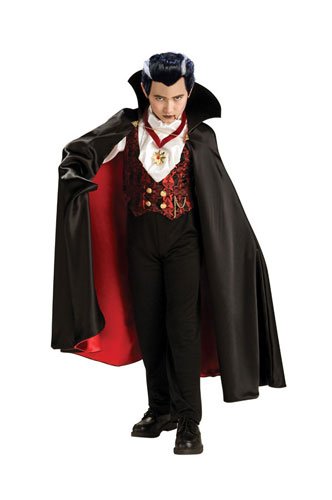 -. Binding : Toy -. Brand : Rubie's -. ClothingSize : One Size -. Color : multi-colored -. Department : unisex-child -. Feature : Costume features white shirt with attached red and black vest / Long black cape with red lining and oversized stand up collar included / Also includes gold-colored medallion with inset red gem / Costume comes complete with elastic waist black pants / Rubies brings fun to dress-up with costumes and accessories kids play with all year long -. Label : Rubies -. Manufacturer : Rubies -. MPN : 883918 -. PackageQuantity : 1 -. PartNumber : 883918 -. ProductGroup : Toy -. ProductTypeName : TOYS_AND_GAMES -. Publisher : Rubies -. Size : One Size -. Studio : Rubies -. Title : Rubie's Transylvanian Vampire Costume -. Warranty : Guaranteed against manufacturer defects
