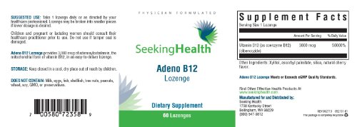 -. Binding : Health and Beauty -. Brand : Seeking Health -. EAN : 0700580723589 -. Feature : Provides 3,000 mcg of Adenosylcobalamin, the mitochondrial form of vitamin B12, in an easy-to-deliver lozenge. / IMPORTANT: Adeno B12 by Seeking Health is manufactured for and sold exclusively by Seeking Health. We DO NOT recommend purchasing this formula from any supplier other than Seeking Health on Amazon.com. / Fast-dissolving lozenges allowing quick release into the bloodstream. / Does not contain milk, eggs, fish, shellfish, tree nuts, peanuts, wheat, soy, GMO, or preservatives. / Products are good for 2 years after the manufacturer date printed on the bottle. -. IsAdultProduct : 0 -. Label : Seeking Health -. Manufacturer : Seeking Health -. MPN : 023-06-001-12 -. PackageQuantity : 1 -. PartNumber : 023-06-001-12 -. ProductGroup : Health and Beauty -. ProductTypeName : ABIS_DRUGSTORE -. Publisher : Seeking Health -. Studio : Seeking Health -. Title : Adeno B12 Lozenge | 3,000 mcg Adenosylcobalamin | Mitochondrial Form of Vitamin B12 | 60 Lozenges | Free of Common Allergens and Magnesium Stearate |Seeking Health -. UPC : 700580723589