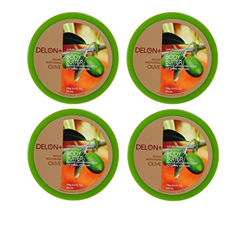 Delon Olive Body Butters in a package of (4). Each is sealed at the factory and 6.9 Oz. Delon Body Butter is specially formulated to create immediate and long lasting softness to dry skin, containing esssential oils that help nourish and hydrate the skin. Olive oil is a all natural product along with being a antioxidant. It also is a excellent emolient which adds to the creamy texture of this intensive moisturizer.Feature