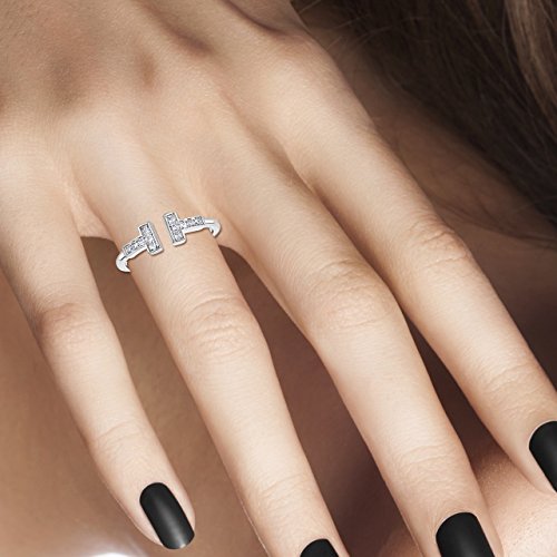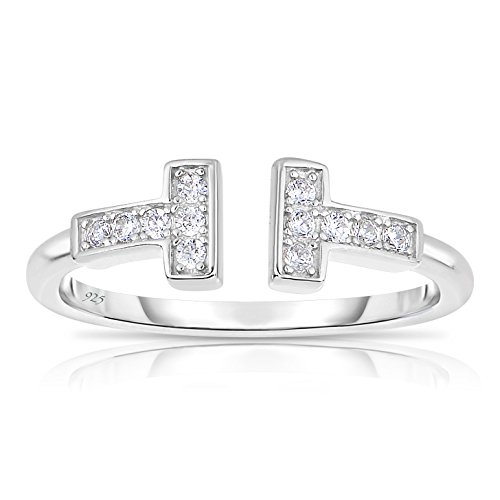 -. Title : Sterling Silver Delicate Double Bar T Ring with White Cubic Zirconia