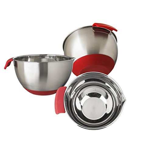[Product Information]- 18/10 stainless steel 3-piece mixing bowl set includes three convenient sizes 5 quart/4.75 liter (10"), 3 quart/2.8 liter (8") and 1 quart/1 liter (6.5")