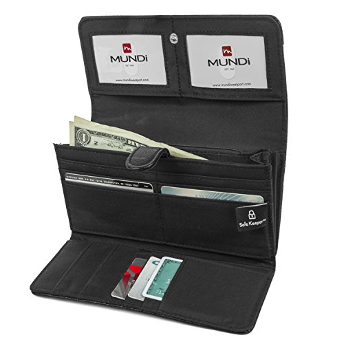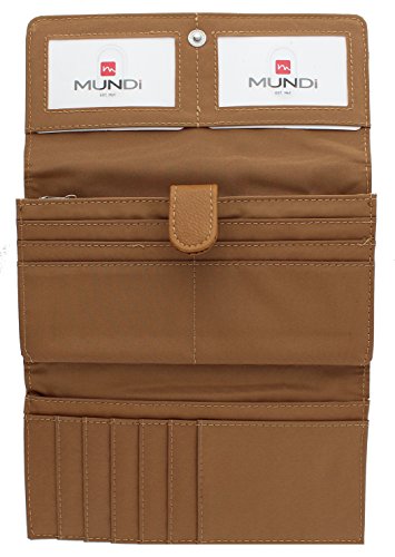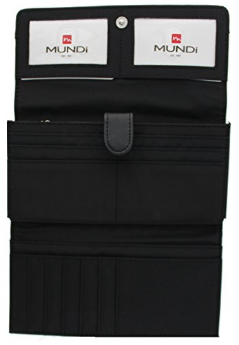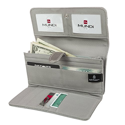-. Binding : Apparel -. Brand : Mundi -. ClothingSize : One Size -. Department : womens -. Feature : RFID WALLET BLOCKING TECHNOLOGY - The Mundi File Master RFID blocking wallet clutch stops theft and electronic pick pocketing, protect your credit cards, debit cards, drivers license, bank cards or any other RFID enabled cards / STOP RFID IDENTITY THEFT RFID PASSPORT WALLET - Blocks scanners and readers from stealing your personal information helping to protect your identity and keep your information safe when you travel when using our womens RFID wallet / BEAUTIFULLY DESIGNED WOMENS WALLET CLUTCH - A stylish pebble pattern print with a snap closure and an interior that features 13 credit card pockets, 2 hidden pockets and 2 interior Picture / ID windows to easily display regularly used cards or photos / INTERIOR FILING SYSTEM - Gusseted compartments labeled for coupons, receipts and cash keeping all your important things organized with space to carry your checkbook / EXTRA STORAGE 2 ZIPPER POCKETS - Inside this womens clutch there is a zipper pocket as well as on the back of this womens clutch there is a zippered coin pocket to keep your loose change and coins -. Model : L34378_A -. PackageQuantity : 1 -. ProductGroup : Apparel -. ProductTypeName : ACCESSORY -. Size : One Size -. Title : Mundi File Master Womens RFID Blocking Wallet Clutch Organizer With Change Pocket