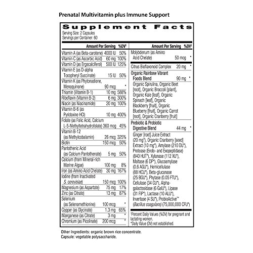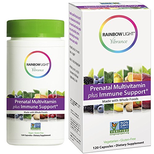 Get the support you and your baby need with Rainbow Light Vibrance Prenatal Multivitamin plus Immune Support. Formulated to meet the unique nutritional needs of moms and babies throughout pregnancy and nursing, this advanced, researched-based formula delivers the essential vitamins and nutrients for vital health. You get 30 milligram of non-constipating iron to support metabolism and red blood cell production, plus 500 IU of vitamin D to promote healthy bones and teeth. To promote baby's healthy brain and spinal development, the formula includes 360 mcg of folate. Citrus bioflavonoids, vitamin C and zinc provide immune support. And, to ease digestive complaints and promote gut health, the formula includes 75 million CFU of probiotics, prebiotics, and a full spectrum of plant-sourced digestive enzymes. For advanced, food-based nutrition, Prenatal Multivitamin plus Immune Support includes 90 milligram of an Organic Rainbow Whole Food Blend of spirulina, beet, broccoli, kale, spinach, blackberry, blueberry, carrot, and cranberry. Organic ginger helps ensure the formula is easy on the stomach.