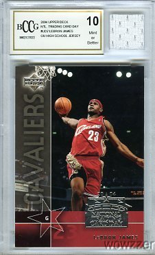 2003/04 Upper Deck NTCD #7 Lebron James rookie with Piece of Authentic Lebron James Game Used High School Jersey Graded BGS BECKETT 10 MINT GGUM Card
