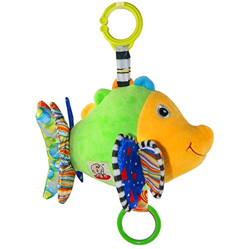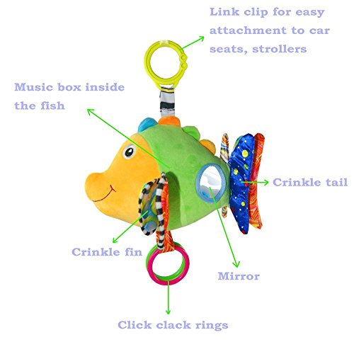 Child-Safe Design Made to be safe for newborns and young children, Fish features a soft velour body that's ideal for cuddling, body with a mirror for interactive play. Multiple textures keep your baby interested, encouraging her to explore. Additionally, the rings clink together. Fish's head with a music box which has 32 melodies, it will play music when pressing the head.