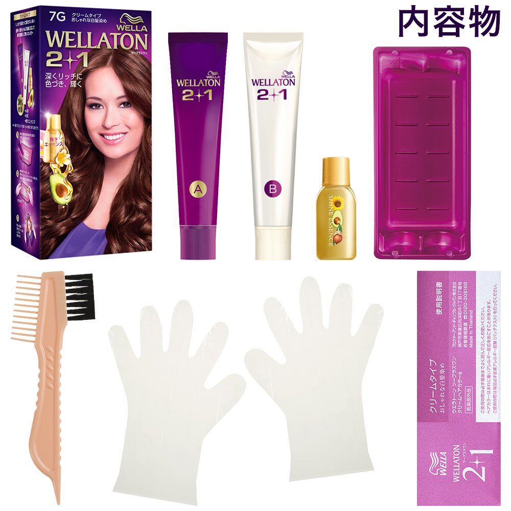 A剤(カラーベース)/B剤(クリームデベロッパー)/エッセンス/混合用トレイ/コームブラシ/手袋/使用説明書
