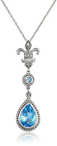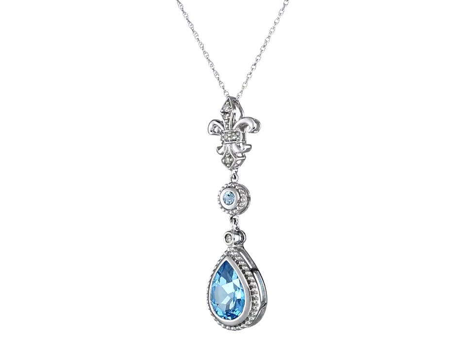 With a pendant measuring in at just under 1.5 inches and featuring an elegant fleur-de-lis, soft blue topaz, and sparkling diamond accents, this necklace is a sophisticated showstopper.