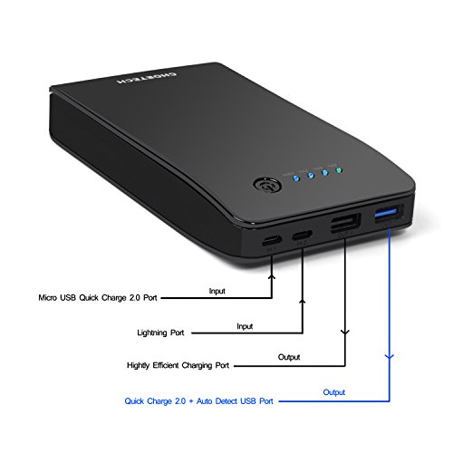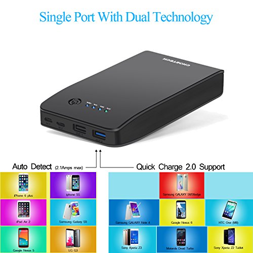 -. Feature : Super high power capacity 15600mAH & Super fast recharge: comes with a Qualcomm Certified Quick Charge 2.0 Adapter charge your external battery 75% faster than standard charger and featured with a quick charge port for devices which support QC 2.0 technology (S6, S6 edge, HTC M9,Nexus 6, Note 4 etc.) charge speed up to 2.4 amps. / Dual USB port with Auto detect technology: one quick charge port (5V/2.4A, 9V/1.7A, 12V/1.3A) for devices which support QC 2.0 technology, charge speed up to 2.4 amps, more efficient and time saving. It also faster charging for non QC 2.0 supported devices. The other non-quick charge port (5V/2.1A) for regularly charge your device in order for long-term use, which is more durable. It's truly universal charger for most of your USB devices. / Dual input port: one special 5V/2.1A lightning port for lightning cable, convenient for Apple users; plug our Qualcomm Certified Quick Charge 2.0 Charger into the other quick charge input port (5V/2.1A, 9V/1.5A) for quick charge your external battery 75% faster than standard charger, power up your external battery with high efficiency. LED indicator to show remaining power available. / Premium quality & Safety Guarantee: Build in high quality Samsung 18650 2600mA battery cell. FCC, CE, RoHS certified. Compact and portable. Multiple built-in safeguards fully protect against over-current, overcharging and overheating for safe and fast charging. / What you get from our CHOTECH: CHOE Quick Charge 2.0 15600mAh Portable Power bank, CHOE Quick Charge 2.0 certified adapter, 12cm USB charging cable, User manual, and 18 Month Worry-Free Warranty.