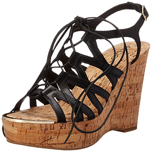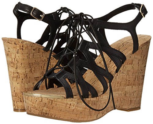 -. Feature : Strappy sandal with faux-cork wedge featuring lace-up vamp and metallic inset at toe / Buckle closure at ankle