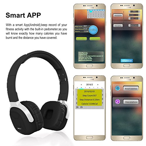 -. Feature : ✔ The use of advanced Bluetooth 4.1 technology and NFC fast pairing function, when high speed connecting, bring higher-quality stereo sound experience. And foldable headset design, it is super easy to bring along wherever you go. / ✔ Uses smart APP (Android OS), and built-in pedometer will keep your fitness activity, so you will know exactly how many calories you have burnt and the distance you have covered. / ✔ Smart multi-point connecting, support two devices connecting at the same time and advanced one-touch selfie function give your life more interesting. So you can seamlessly switch between your business and personal phones. / ✔ Super long and excellent battery, with 800mAh high capacity rechargeable build-in lithium battery, the wireless headphones last up to 60 hours talking time, 45 hours music time and 180 hours standby time, giving you more usage per charge than other bluetooth headset. / ✔ Supports hands-free call with built-in microphone and voice reporting incoming call number (Supports four languages: Chinese / French / English /Spanish). Also supports answer / hang up calls, volume control, move next / move previous, redial the last dialed number. Soft and ventilated, moderate elastic, skin-friendly and diving fabrics.
