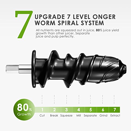 ✔ Highest Juice Yield - Slow juicer is higher juice yield by the auger squeezing and reverse function. Preserves natural taste and nutrients which lost by high-speed centrifugal juicers grinding, crushing, and heating (from the fast-rotating blade)