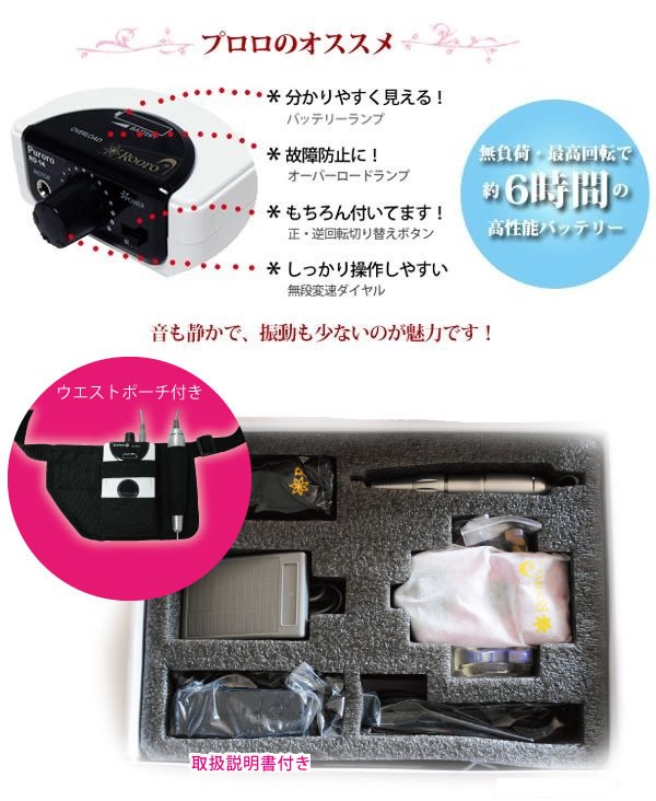| セット内容 | プロロ本体、ハンドピース、フットスイッチ、ウエストポーチ、充電コード、本体スタンド、ビットセット(バレルカーバイト(ミディアム)、セラミックグリーンビット180号、サンディングバンド(ミディアム)1個、マンドレール、ブラシビット)、取扱説明書、保証書(保証期間:1年間) |
