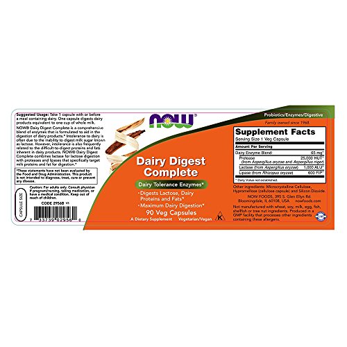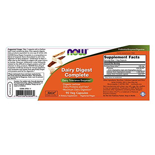 NOW® Dairy Digest Complete is a comprehensive blend of enzymes that is formulated to aid in the digestion of dairy products. Intolerance to dairy is often due to the inability to digest milk sugar known as lactose. However, intolerance is also frequently related to the difficult-to-digest proteins and fats inherent in dairy products. NOW® Dairy Digest Complete contains not only lactase for lactose digestion, but also proteases and lipases that specifically target milk poteins and fat for digestion. With Dairy Digest Complete, it is possible to ease temporary discomfort associated with the incomplete digestion of dairy products, while enjoying the taste and health benefits of them as well.*Feature