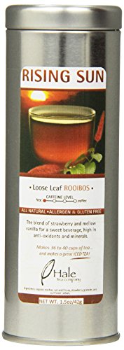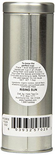 -. Binding : Grocery -. Brand : Hale Tea -. EAN : 0603932570292 -. Feature : 1.5-Ounces of Loose Tea / Strawberry and vanilla / Naturally caffeine free; Serve hot or iced. / Interior seal silver tin / Hale Tea Company based in Savannah, Georgia; Traces its roots back to a humble tea shop in London, England in 1872 -. Label : Hale Tea Company -. Manufacturer : Hale Tea Company -. NumberOfItems : 1 -. PackageQuantity : 1 -. ProductGroup : Grocery -. ProductTypeName : GROCERY -. PublicationDate : 2012-06-11 -. Publisher : Hale Tea Company -. Size : 1.5 Ounces -. Studio : Hale Tea Company -. Title : Hale Tea Rooibos, Rising Sun, 1.5-Ounce -. UPC : 603932570292
