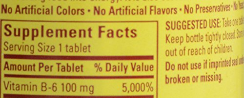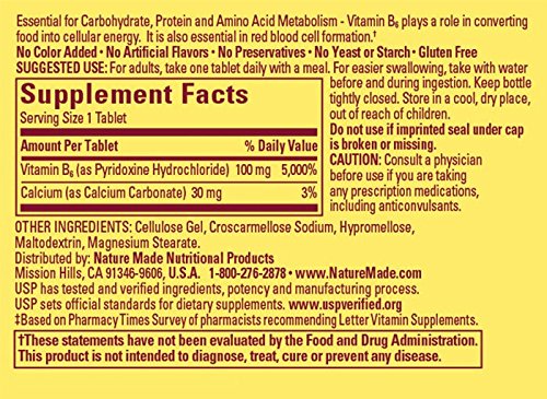 -. Binding : Health and Beauty -. Brand : Nature Made -. EAN : 0031604012854 -. Feature : Recommended as part of daily regimen for women's health, mood, and energy / May improve mood by enhancing brain neurotransmitters / Plays a vital role in cell development and proper function of immune system / null -. IsAdultProduct : 0 -. Label : Nature Made -. Manufacturer : Nature Made -. Model : thomaswi -. MPN : thomaswi -. NumberOfItems : 1 -. PackageQuantity : 1 -. PartNumber : thomaswi -. ProductGroup : Health and Beauty -. ProductTypeName : HEALTH_PERSONAL_CARE -. PublicationDate : 2017-09-01 -. Publisher : Nature Made -. ReleaseDate : 2017-09-01 -. Size : 100 MG -. Studio : Nature Made -. Title : Nature Made Vitamin B-6 100 mg, 100 ct -. UPC : 031604012854