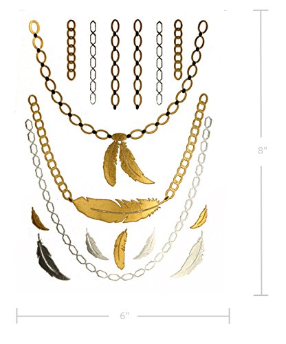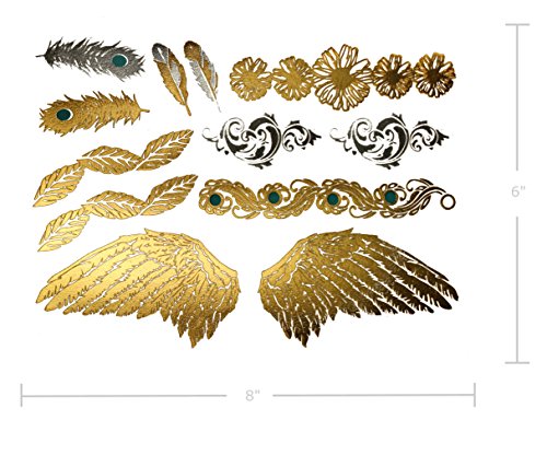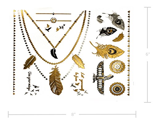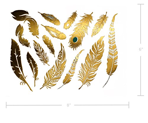 Terra Tattoos Metallic Tattoos - Over 75 Boho Feather Temporary Tattoos in Gold and Silver (6 Sheets), Destiny Collection