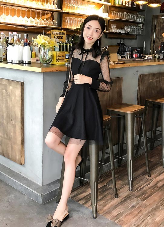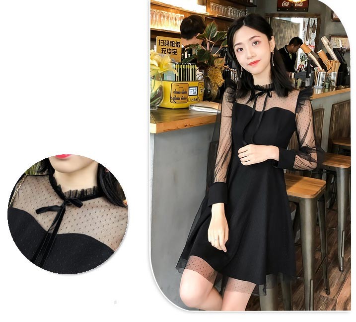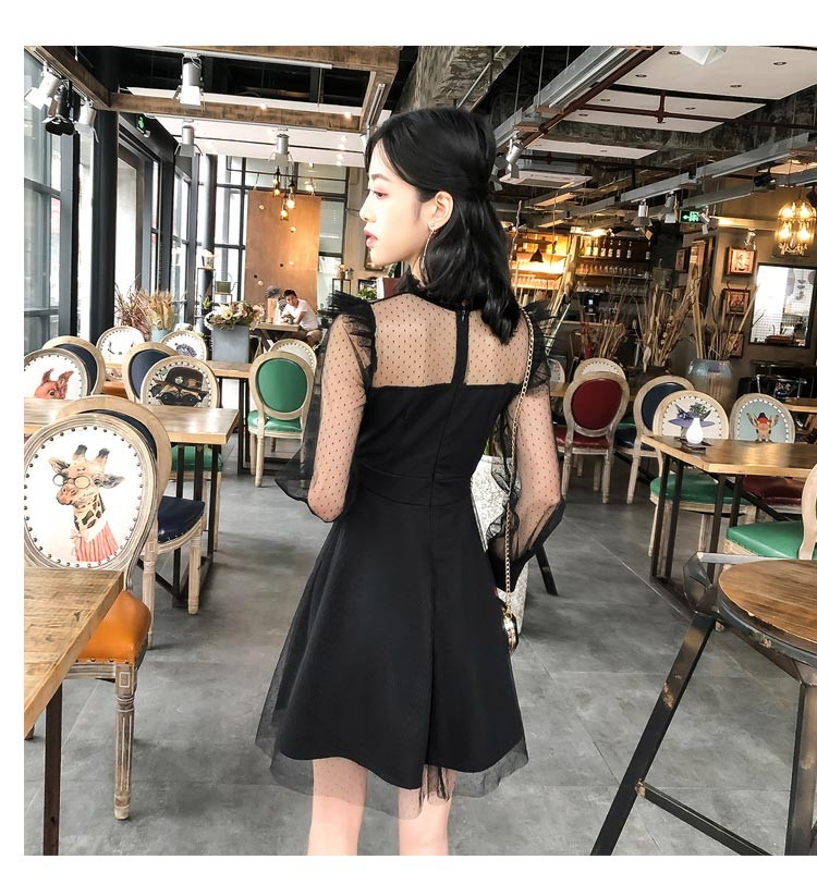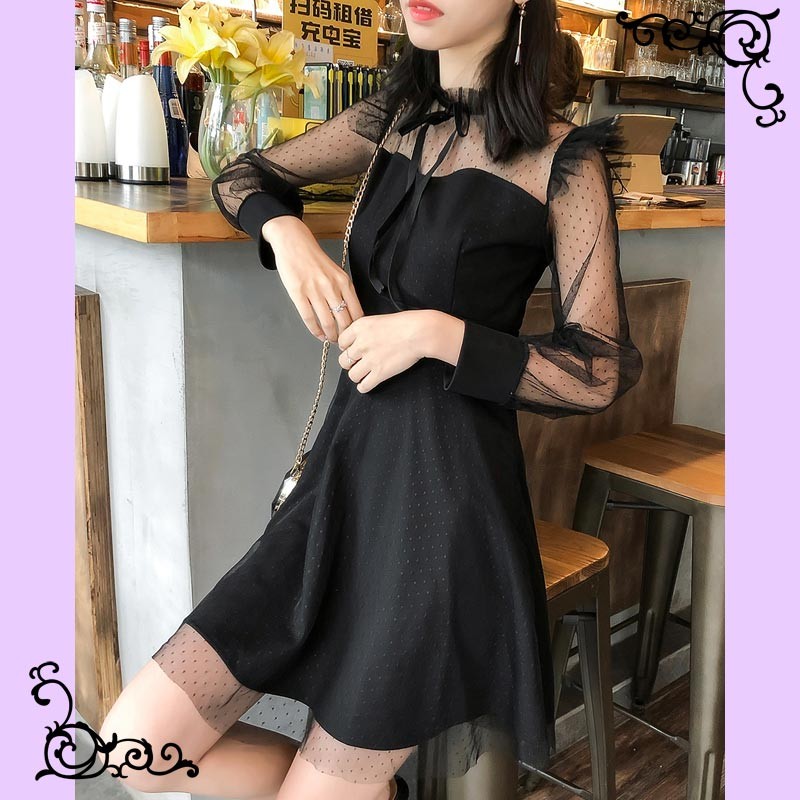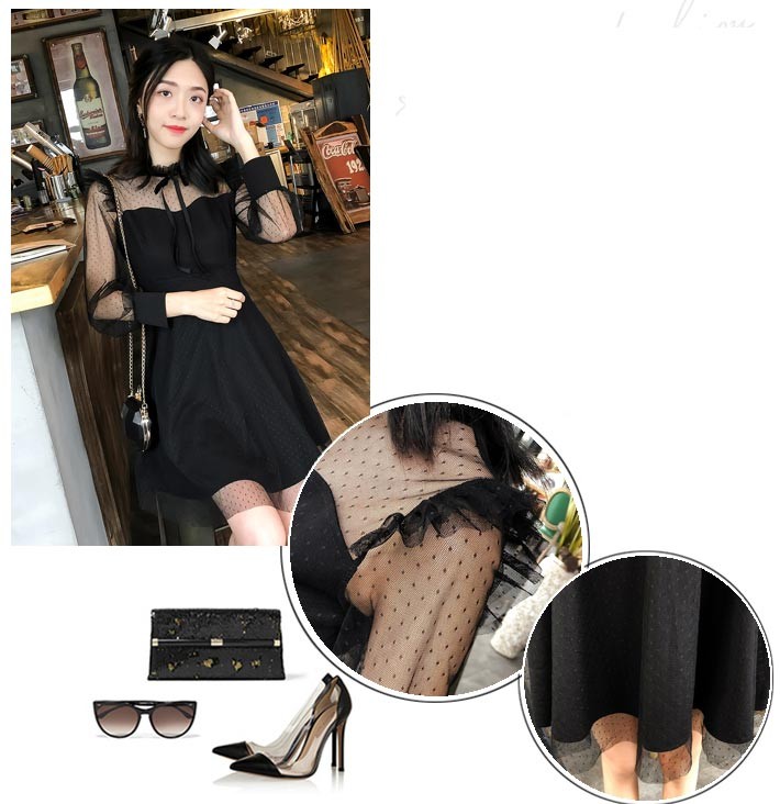 ドットプリントのレースとフレアがたっぷりスカートのブラックドレス♪