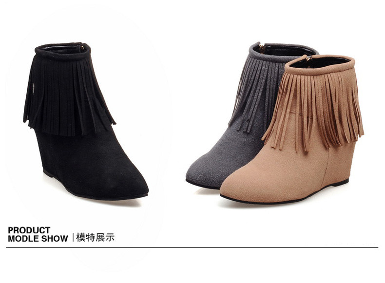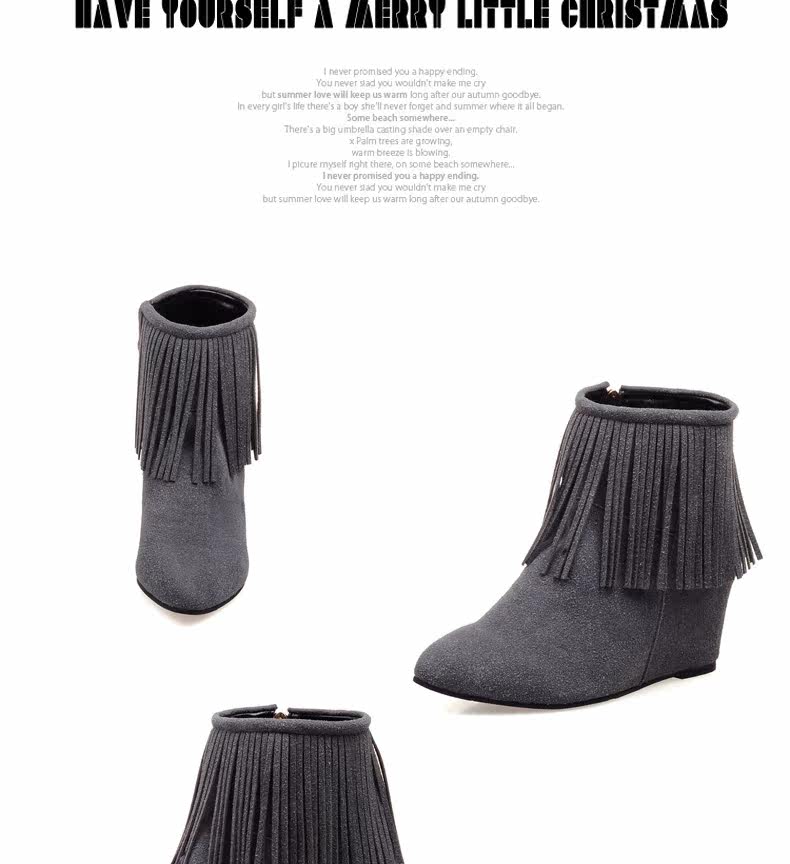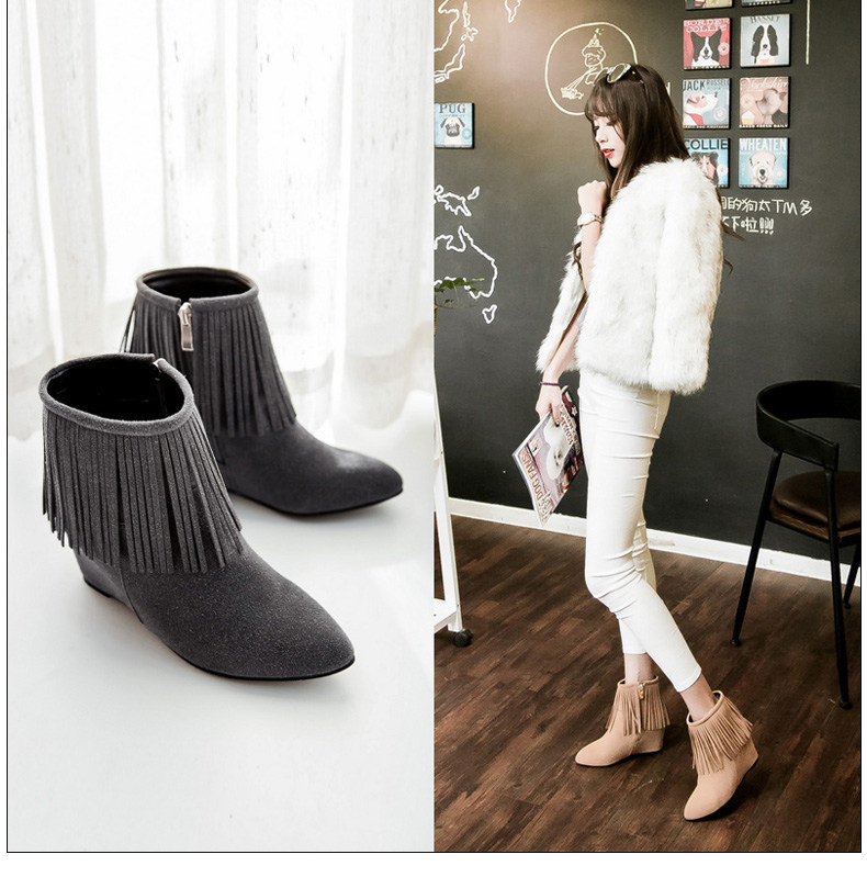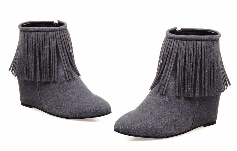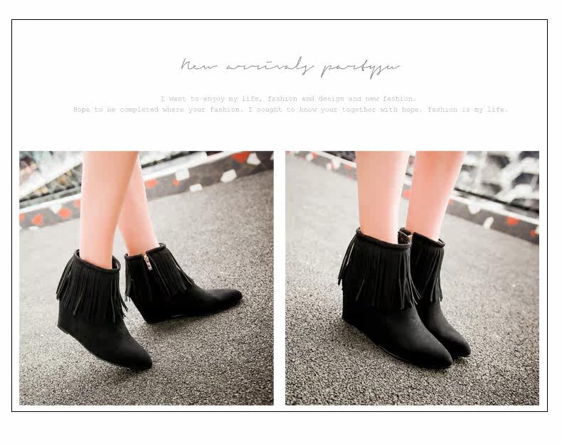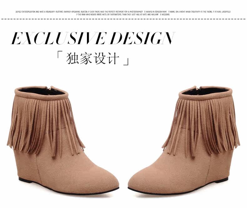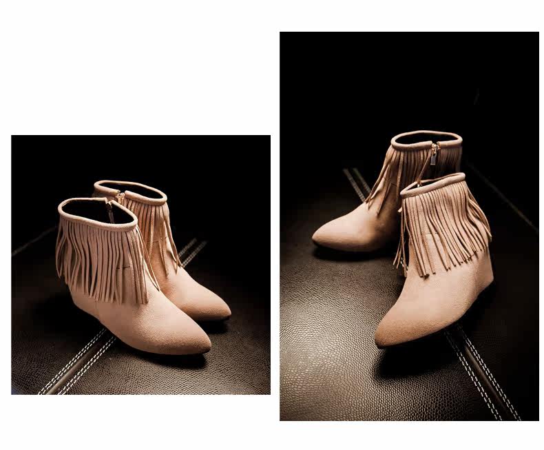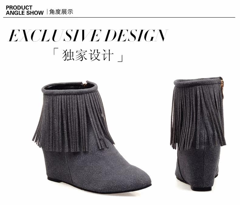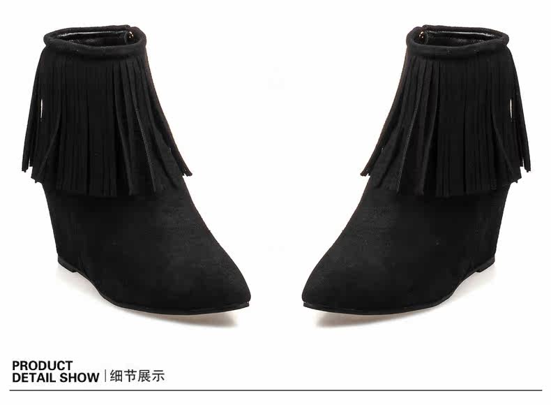 新品流苏靴高跟女鞋坡跟短靴女裸靴流苏短靴内增高大码流苏鞋