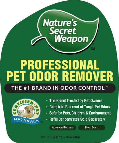Developed by National Odor Removal Experts. Veterinarian and customer approved at eliminating even the strongest pet urine odors at their source. Nature's Secret Weapon is 100% guranteed to work better than any other pet odor remover.
