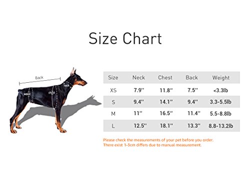 Size----Neck-------------------Chest-------------------Body-------------------Weight XS------17cm/6.7inches------35cm/13.8inches----- 21cm/8.3inches-------- <3.3lb S-------18cm/7.1inches------36cm/14.2inches----- 26cm/10.2inches-------- 3.3-5.5lb M------22cm/8.7inches------41cm/16.1inches----- 30cm/11.8inches------ 5.5-8.8lb L-------27cm/10.6inches------50cm/19.7inches----- 36cm/14.2inches------ 8.8-13.2lb Please CHECK dimensions carefully before you decide which size to buy. Size up if your pet's body length is longer than normal.