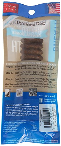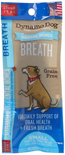 -. Binding : Misc. -. Brand : Cloud Star -. EAN : 0693804214218 -. Feature : Dynamo Dog Functional Dental Bones are powerful dental bones with a textured surface to help remove plaque buildup and promote healthy gums / Functional Dental BonesUnique textured surface to help remove plaque and tarter buildup / Made in the USAMade with healthy fruits and vegetablesGrain FreeGluten Free -. Label : Cloud Star -. Manufacturer : Cloud Star -. Model : 21421 -. MPN : 21421 -. NumberOfItems : 1 -. PackageQuantity : 1 -. PartNumber : 21421 -. ProductGroup : Pet Products -. ProductTypeName : PET_SUPPLIES -. Publisher : Cloud Star -. Size : Small -. Studio : Cloud Star -. Title : Cloud Star Dynamo Dog Functional Dental Bones, Breath Formula, 1.5-Ounce Single Bone -. UPC : 693804214218
