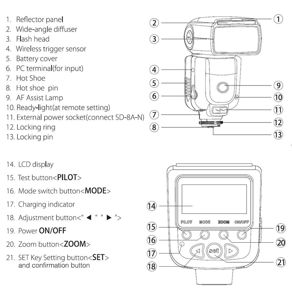 E-TTL functions: automatical output power that is suitable for the current environment according to the pre-flash and camera light evaluation system.