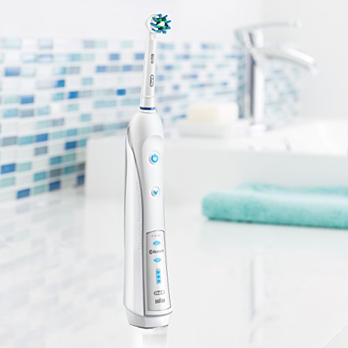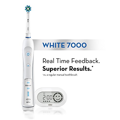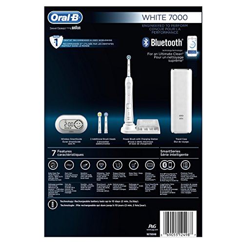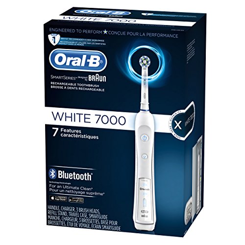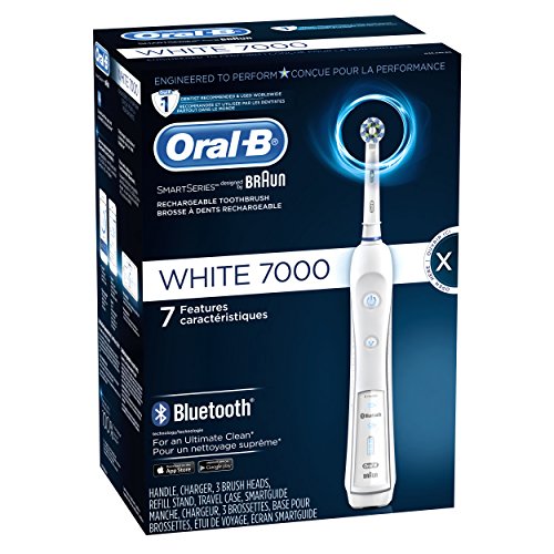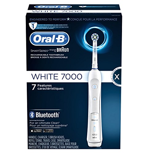The Oral-B WHITE 7000 SmartSeries rechargeable electric toothbrush with Bluetooth is the world’s first of its kind with Bluetooth connectivity. Bluetooth communication allows the brush to connect with your smartphone to give you real-time feedback on your brushing habits. The professionally inspired design of the CrossAction brush head surrounds each tooth with bristles angled at 16 degrees, and 3D cleaning action oscillates, rotates, and pulsates to break up and remove up to 100% more plaque than a regular manual toothbrush. The pressure sensor lights up if you brush too hard to prevent harmful over-brushing and there are 6 modes and a timer to help you brush for a dentist-recommended 2 minutes. Best of all, it’s brought to you by Oral-B – the #1 brand used by dentists worldwide (data on file). - Satisfaction Guaranteed or your Money Back: Try it with no risk for 60 days! If you are not 100% satisfied, receive a full refund via pre-paid card. Return the product in its original packaging with the original cash receipt postmarked within 60 days to receive a pre-paid card in the amount of your purchase, plus tax and Canada Post 1st class mail postage. Terms of prepaid card apply. 2 Year Limited Warranty. Warranty includes replacement or repair of product. Proof of date of purchase required. Terms and conditions apply. (Full details inside of pack.) Compatible with the following replacement toothbrush heads: CrossAction, 3D White, Sensitive Clean, Precision Clean, FlossAction, TriZone, Deep Sweep, ProWhite, Ortho, PowerTip, and Dual Clean.