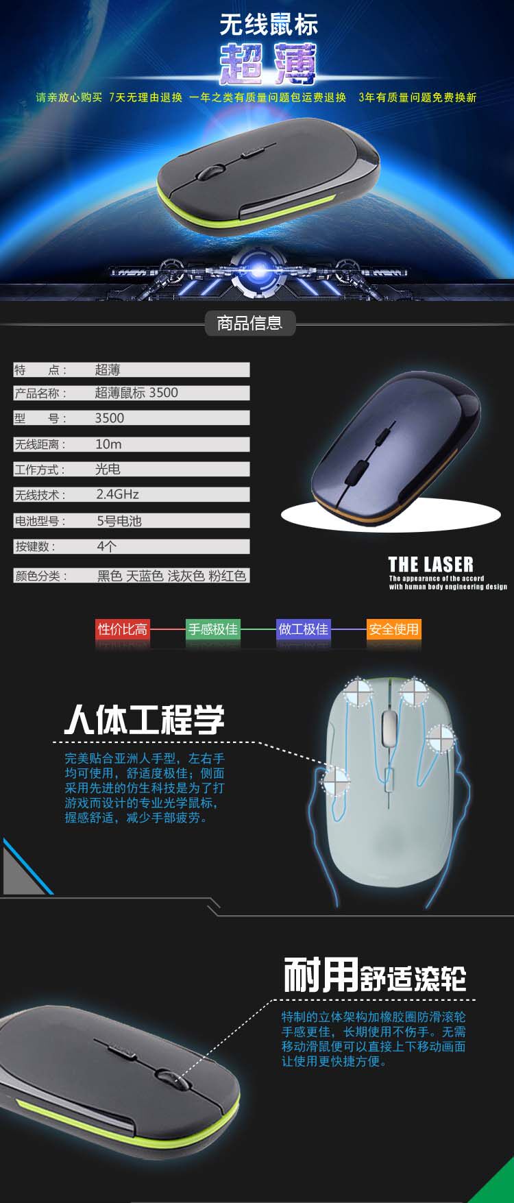 product characteristics: 1, 10 m distance wireless mobile; & nbsp; & nbsp; & nbsp; 2, the resolution frequency conversion button resolution frequency switching (1000dpi-1200dpi-1600dpi) third gear speed can be realized; 3, can realize on line scrolling; 4, automatic sleep power saving function, intelligent sleep save electricity, more durable; 5, the shortcut keys can be used to browse the Internet or applications, easy to implement &ldquo on the toolbar; forward ” “ ” function; 6, high performance wear pads, sliding easily accessible.