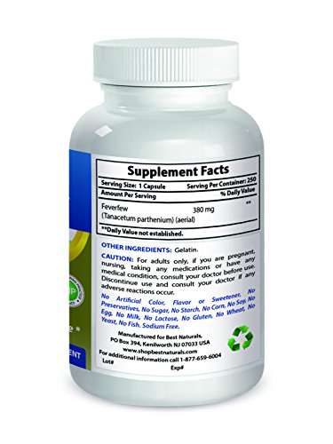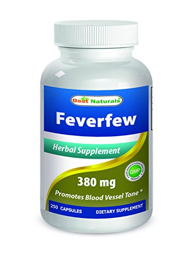 -. Binding : Health and Beauty -. Brand : Best Naturals -. EAN : 0817716014395 -. Feature : Herbal Supplement / Promotes blood vessel tone* / Supports healthy digestive function* / Supports healthy Kidney function* / All Best Naturals products are manufactured in accordance with Good Manufacturing Practices (GMP), among the highest standards in the world -- Proudly Made in USA -- Purity & Potency Guaranteed -. IsAdultProduct : 0 -. Label : Best Naturals -. Manufacturer : Best Naturals -. ProductGroup : Health and Beauty -. ProductTypeName : HEALTH_PERSONAL_CARE -. Publisher : Best Naturals -. Studio : Best Naturals -. Title : Feverfew 380 mg 180 Capsules by Best Naturals - Manufactured in a USA Based GMP Certified and FDA Inspected Facility and Third Party Tested for Purity. Guaranteed!! -. UPC : 817716014395