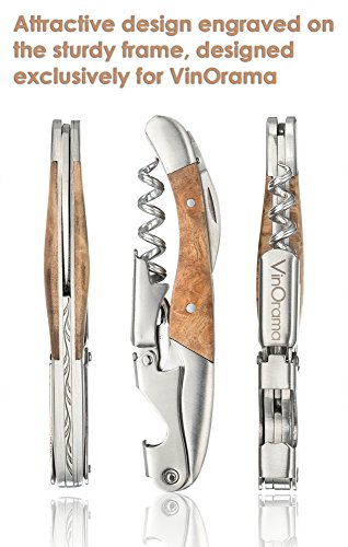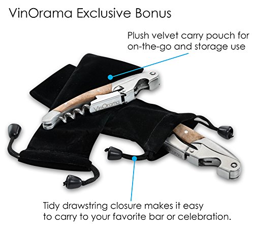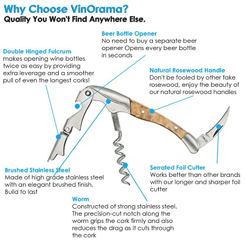 -. Feature : THE KING OF THE CORKSCREW MAJESTY! VinOrama's superior, hand crafted corkscrew is designed to satisfy the wine lover's desire for a top-notch wine bottle opener. The handle is made of the finest quality, hand-picked durable rosewood, and unlike others, each of our corkscrews owns its unique figure. / INTRICATE DESIGNED WORM is constructed of strong polished steel and is guaranteed to neatly remove any natural or synthetic cork effortlessly! The precision-cut notch along the worm grips the cork firmly and also reduces the drag as it cuts through the cork, making it less likely the cork will disintegrate. / The DOUBLE-HINGED FULCRUM makes opening wine bottles twice as easy by providing extra leverage and a smoother pull of even the longest corks! the two piece hinge offers a significant powered advantage over the older style single hinge corkscrew, by creating a nice 2-part cork removal. / The LONG, ROUNDED AND SERRATED FOIL CUTTER makes foil removal quick and mess-free. Works better than other brands with our longer and sharper foil cutter, It is also exclusively designed to minimize any ripping of the foil or plastic. and eliminates the need to purchase another gadget. / PRESENTABLE GIFT PACKAGING includes captivating matte gift box and elegant black velvet carry pouch. Extremely portable and geared for travel. Elegant design features the company's logo imprinted on the double-hinge and an attractive design engraved on the sturdy frame. This corkscrew is sure to be something you'd love to give-and love to get!! Our wine opener is guaranteed-LIFETIME. So order now with complete confidence and peace of mind. We know you'll be coming back for more!