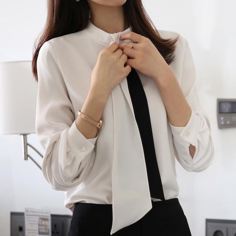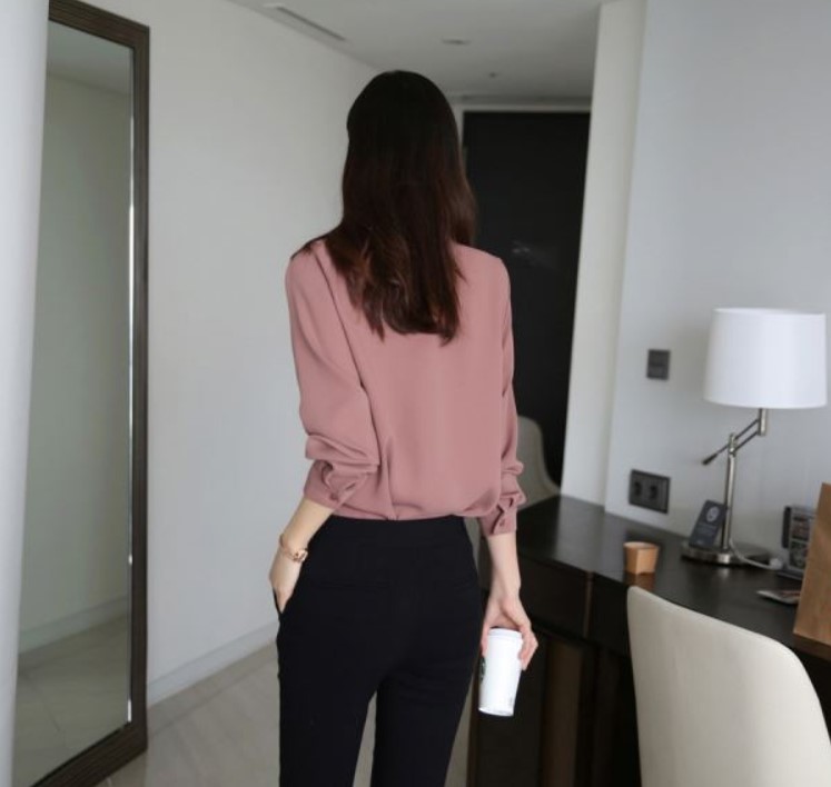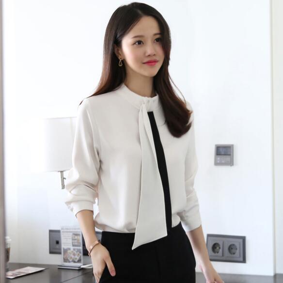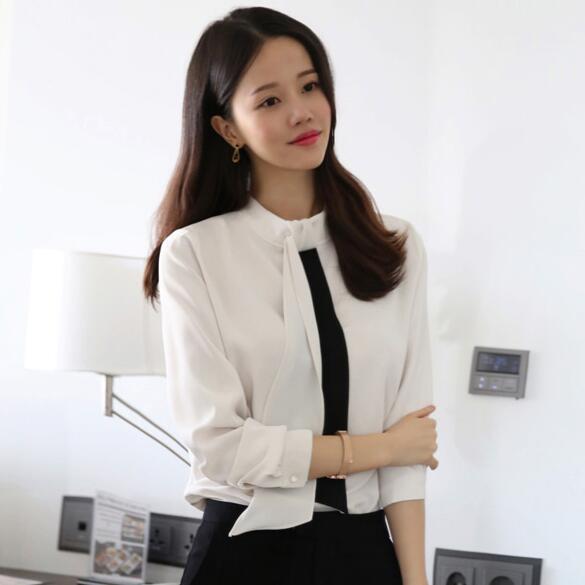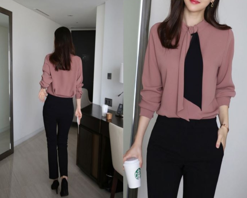 印象的なバイカラーのボウタイブラウス。