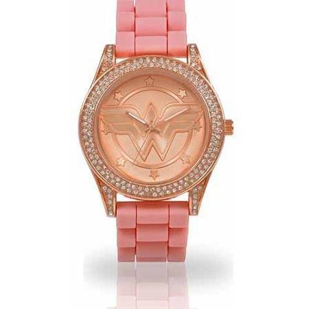 -. Title : Wonder Woman Rhinestone Accented Rose Gold Tone Watch with Pink Rubber Strap