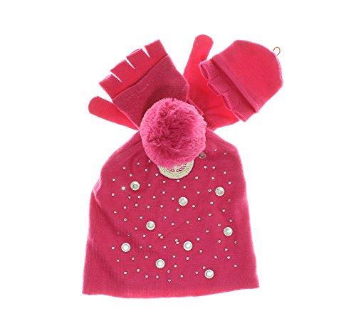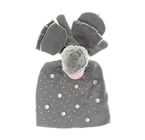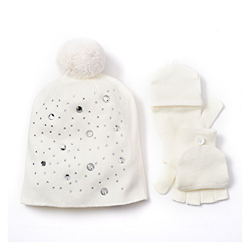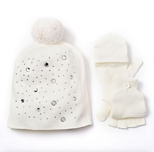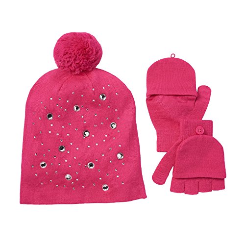 Product DescriptionThis girls' SO set includes mittens that convert to gloves - Set includes: hat pair of mittens - Fluffy pom-pom accent - Jeweled accents on cap - Acrylic - Machine wash - Imported0
