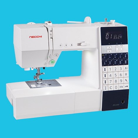 -. Feature : The Necchi EX100 computerized sewing machine has advanced features, outstanding standard accessories, and award winning design. / The top of the line EX100 includes 100 stitches, start/stop button, automatic thread cutter, and built-in needle threader. / Plus a 16" x 11" extension table, 3 piece LED light, optic magnifiers in three different magnifications and knee lifter are standard features. / Start/Stop button, Speed control slider,Direct stitch selection keys •Optical magnifiers - three magnifications •Memorized needle Up/Down with Down as default •7-piece feed dog.