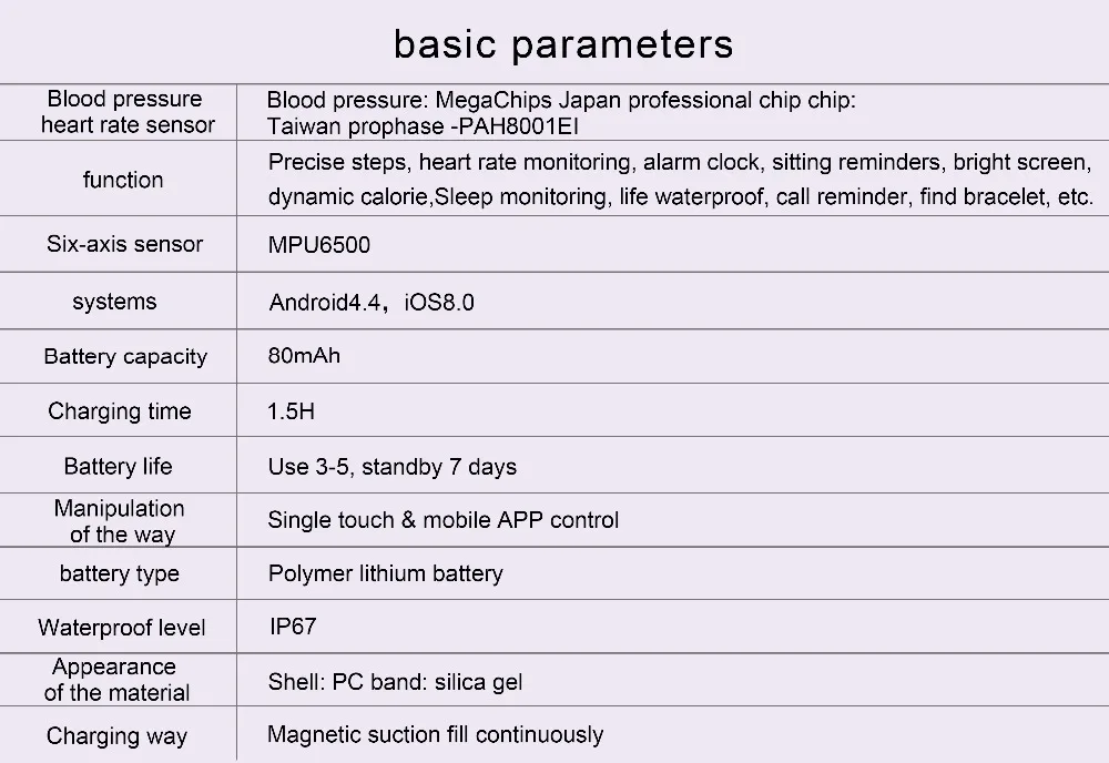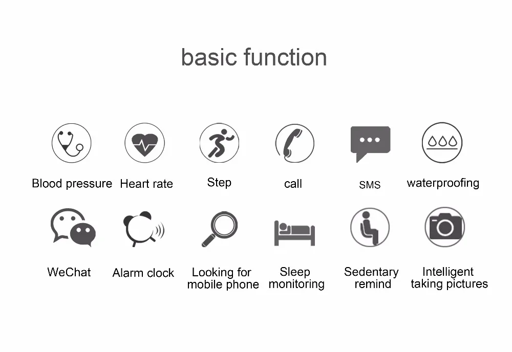 Function:Message Reminder,Blood Pressure,Call Reminder,Passometer,Heart Rate Tracker