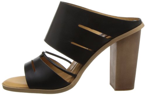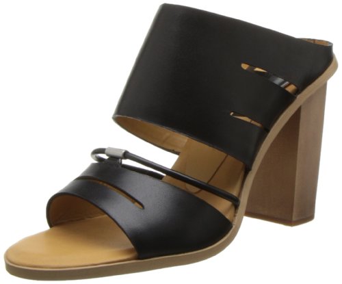 Block-heel sandal featuring slit straps and silver-tone hardware at vamp