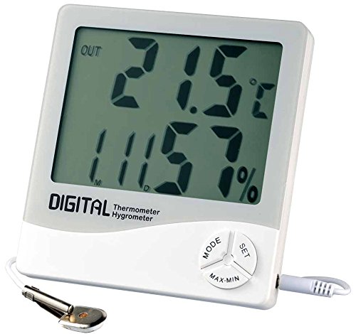 -. Feature : サイズ:(約)高さ10.6×幅9.8×奥行き2.3cm / 本体重量:(約)150g / 外枠材質:ABS樹脂、ポリカーボネート樹脂 / 風防材質:プラスチック / 生産国:中国 / 表示内容:温度、湿度、時刻、カレンダー / 本体温度測定範囲:-10℃~50℃ 外部センサー温度測定範囲:-50~70℃ / 湿度測定範囲:20~90%RH / その他機能:屋内温度・湿度と外部温度を同時計測、時刻・日付自動切り替え表示、過去の最高最低温度表示、最高最低湿度表示、時計表示(12・24時間表示切替可)、目覚ましアラーム、時報、置き掛け兼用