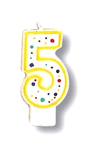 - Wax candle molded into a number 5; white candle with colorful polka dots, outlined in yellow