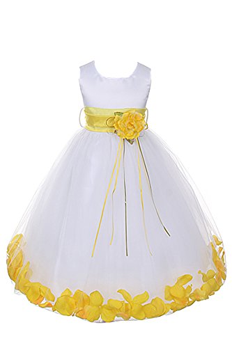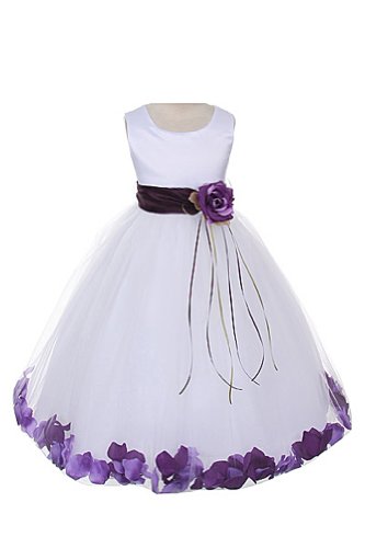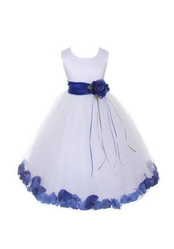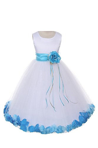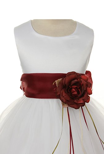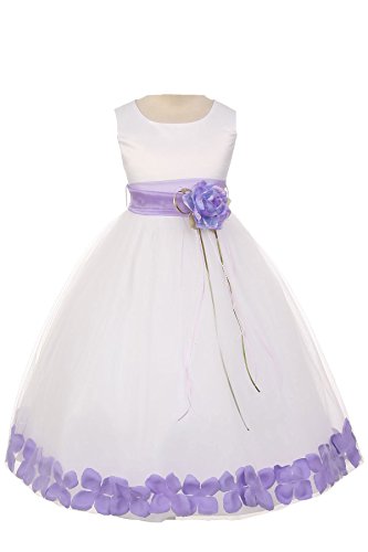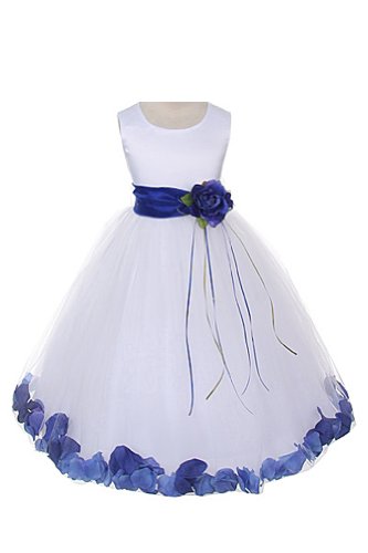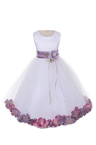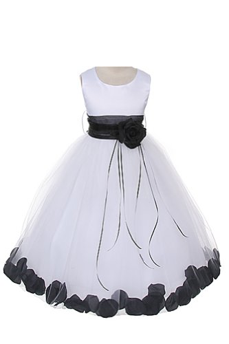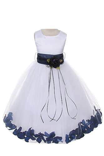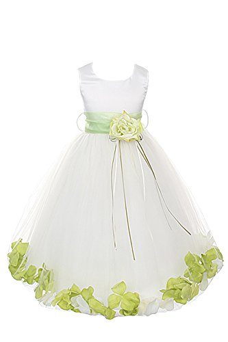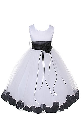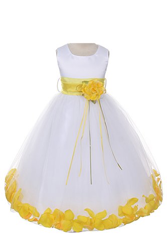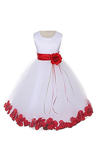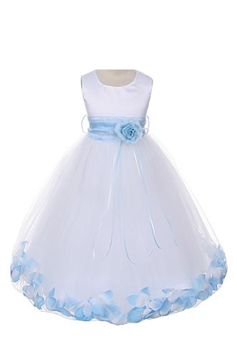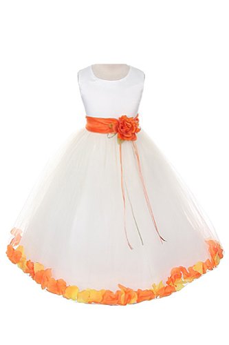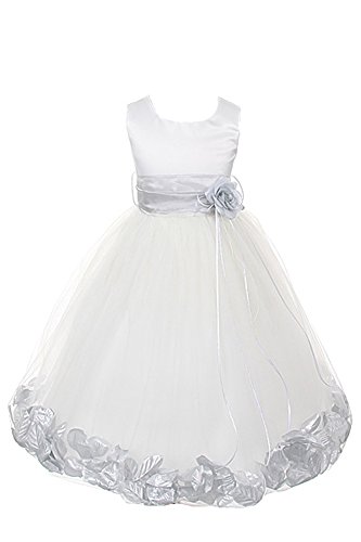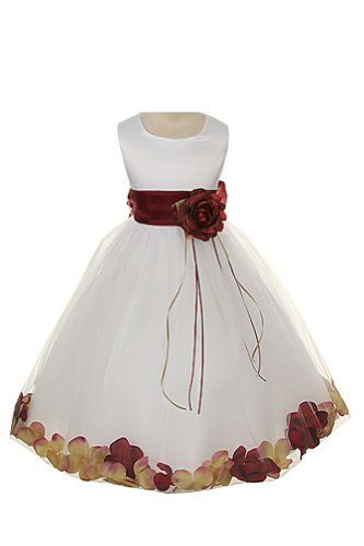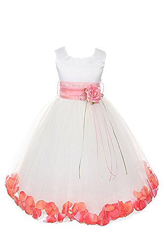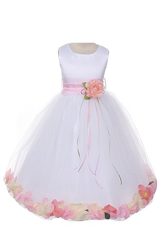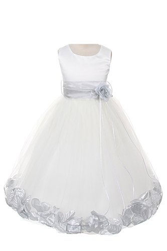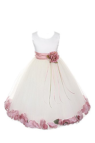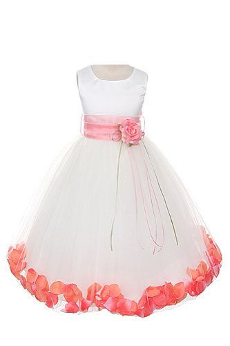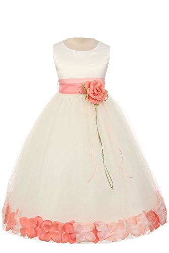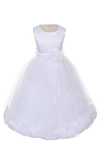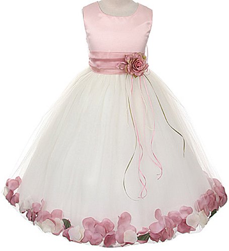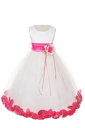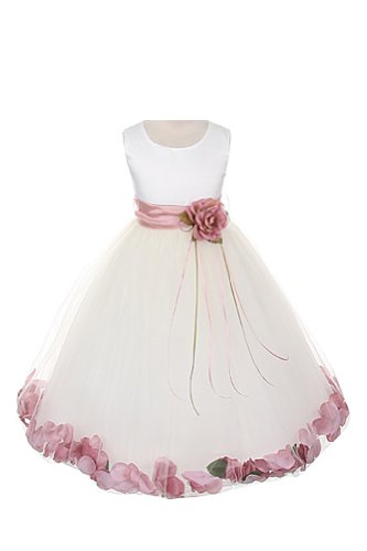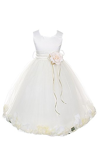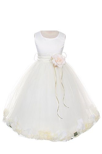 Communion, Weddings, Church, Flower Girl, Pageant, Birthday, or any Special Event: Satin Bodice with Tulle Skirt containing Floating Petals Tea-Length Girl's Dress. 21 Different Colors in White or Ivory. (Rose Bodice Dress is Ivory). Infant S-XL and Girl's Sizes 2-14 Available. Zipper Back has a Self-Tie Sash. 100% Polyester. Made in the USA.Feature