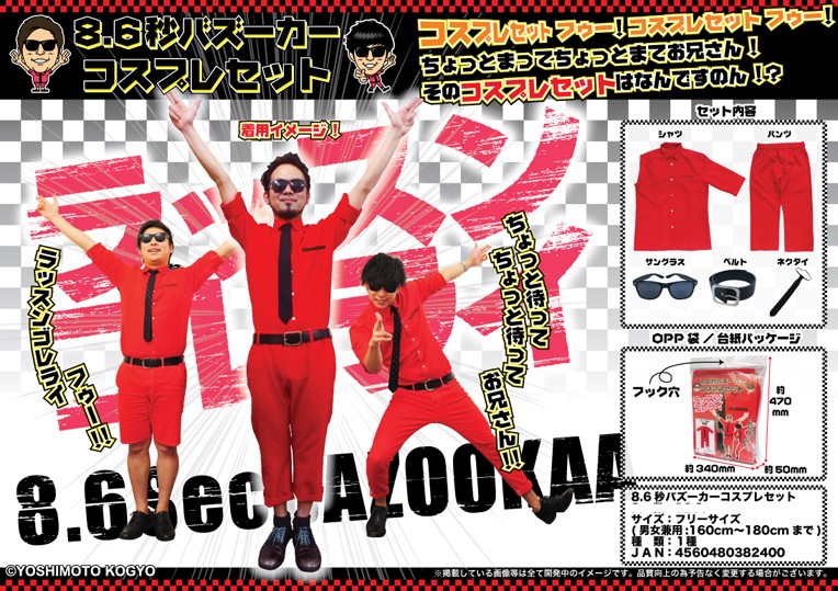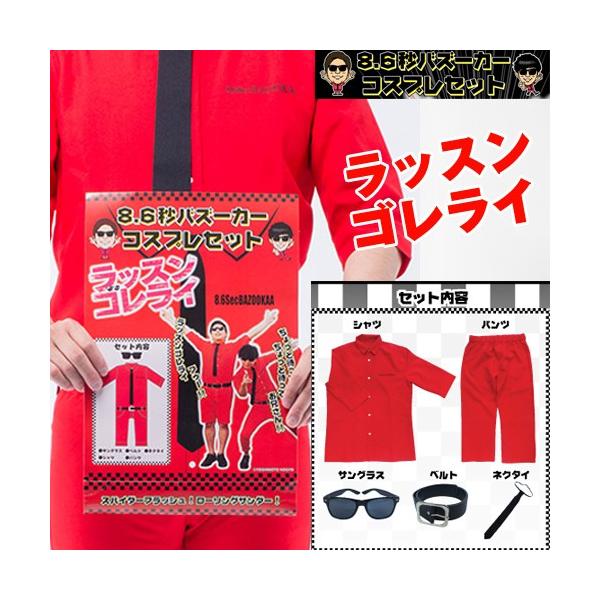 ちょっと待ってちょっと待ってお兄さん!!そのコスチュームセットはなんですの!? ラッスンゴレライ!!・・・世間をにぎわすあのコンビ「8.6秒バズーカー」のオフィシャルコスプレセットが新登場!! ↓こちらもご一緒にどうぞ↓【8.6秒バズーカー”音声ネタ入れ”電卓(先着50名様お笑いキーチェーンプレゼント)】はこちらをクリック