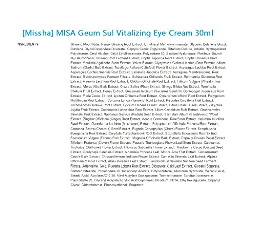★MISA Revitalizing Eye Cream helps treat signs of aging, such as fine lines, wrinkles, and shadows around eyes. Contains Ginseng Water, Wild Ginseng Extract, Deer Antler Extract, and Reishi Mushroom Extract for a more youthful and brighter appearance. The mild formula is free of Paraben, Colorants, Triclosan, Benzophenone, Talc, and Mineral Oil.