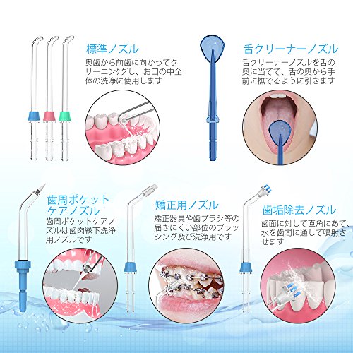 口腔を保護するために、日ごろの洗浄が大切です。歯ブラシでの清掃のみならず、口腔洗浄器をはじめとする補助清掃具の使用が必要になるのです。弊社の歯間ジェット洗浄はノズル5種類があって、合計7本です。ノズルの種類によって、口のすべての部分を清掃することができます。歯と歯の隙間の汚れや食べカスはもちろん、矯正器具まわり、舌についた汚れもしっかり除去できます。