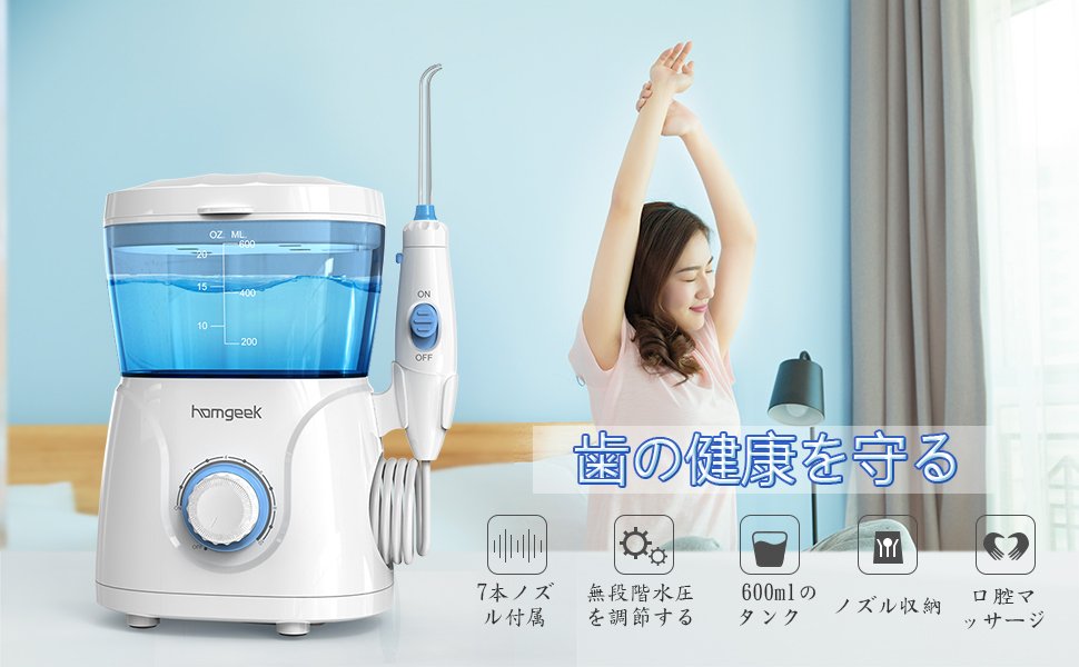 1700パルス/分の高い頻度と360°回転ジェット噴射の口腔洗浄機が一般の歯ブラシでは磨きづらいところまで入りこみ歯周病や虫歯などの原因となる食べかすや歯垢をしっかり落とす!お子様がいるご家庭も楽にお使いいただけます。使用する場所・目的にあわせて、10段階の水圧コントロールが可能です。ほどよい刺激で歯グキをマッサージして、血行をよくします!