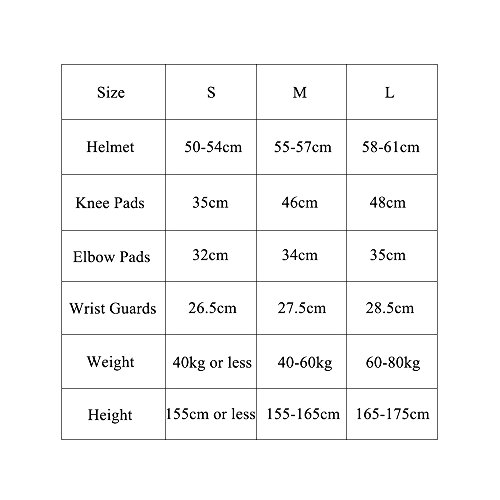 -. Feature : 7 Pcs Sport Protective Gear protects you from accident fall or scratch with 1* Helmet, 2*knee pads, 2*elbow pads, 2 wrist pads. / Premium Material: the helmet is made form durable ABS+EPS+Sponge and the other pads are made from Polyster and PE, anti-wearing and anti-shock, breathable and comfortable for your wearing / Adustable Design: Multiple elastic strap and velcro closure customize your protective gear for more comfortable and secure wearing. / Multipoposal Using: best choice for BMX/Road Biking,roller blading,Skateboarding,Scooter Practicing,skiing, snowboarding,snowmobiling, outdoor sports etc. / Advailable Size: S, M, L(Size Chart can be found in the picture); perfect for kids, children, teenagers, youth, men, women, boys and girls etc.