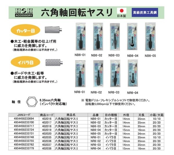 【商品名】(業務用3個セット) H&H 六角軸回転ヤスリ/先端工具 【カッター目】 高級炭素工具鋼 日本製 NB6-02 〔DIY用品/大工道具〕