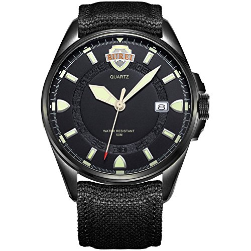 -. Title : BUREI Men's Luminous Military Stainless Steel Date Watch with Black Canvas Leather Band