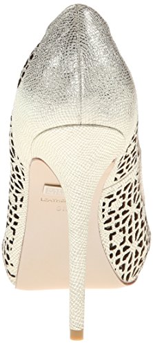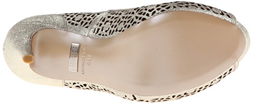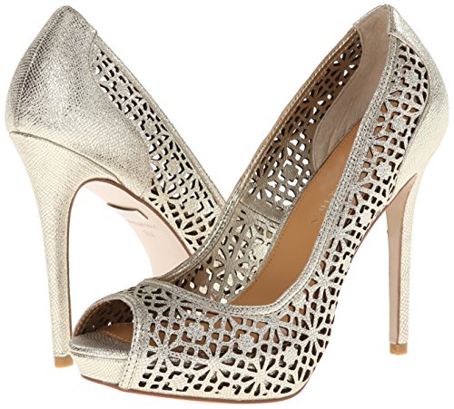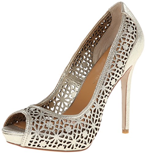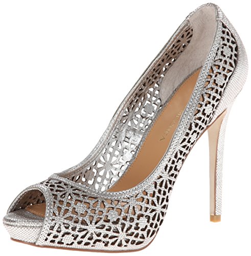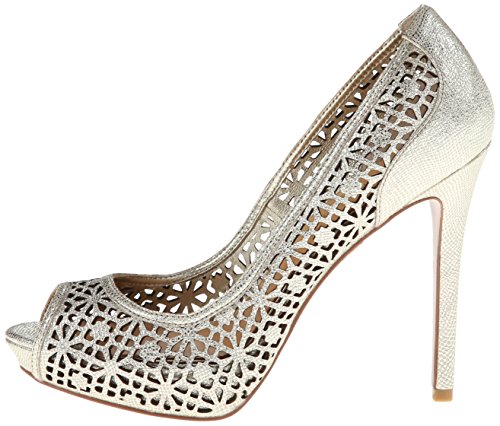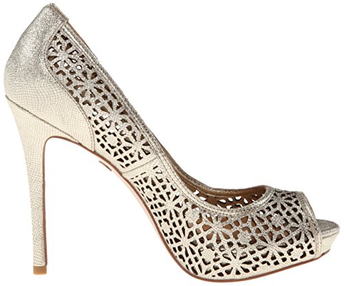 Peep-toe dress pump featuring Art Deco-inspired laser cutouts and solid covering at heel and cap Partially concealed platform Brand : Badgley Mischka Item model num : Junior MPN(PartNumber) : MP2918-298 EAN : 0749908901216 Product Dimensions(LxWxH) : 31x11x21cm ; 1111 g
