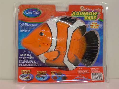 -. Binding : Toy -. Brand : Rainbow Reef -. EAN : 0795861170015 -. Feature : Bring your pool to life! / Fish can swim into deep water. / Fish is orange with 2 white stripes -. IsAdultProduct : 0 -. Label : Swim Ways -. Manufacturer : Swim Ways -. Model : 17001 -. ProductGroup : Toy -. ProductTypeName : TOYS_AND_GAMES -. Publisher : Swim Ways -. Studio : Swim Ways -. Title : Swim Ways Rainbow Reef with Real Life Swimming Action -. UPC : 795861170015