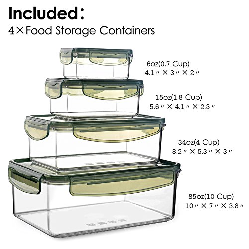 - ☆ Size: 8 Piece Food container set comes in 4 practical stackable sizes: 6oz(0.7 Cup), 15oz(1.8 Cup), 34oz(4 Cup), 85oz(10 Cup). Perfect for food seal at home or for travel, packing work and school lunches.